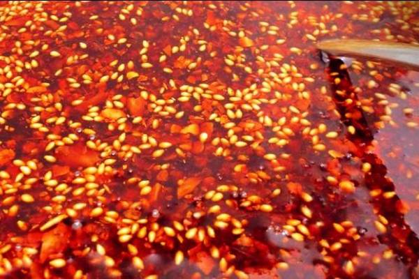 A、鍋內倒入菜籽油10斤煎至260-280度去菜油的生味(油和辣椒面的比例為5:1,即5斤菜油1斤辣椒面,10斤菜油2斤辣椒面),把中好的辣椒面分別:皺皮椒面500G、二荊條和子彈頭混合面500G和勻在一起(都不計損耗情況下)取出一半倒入紅油桶中,另放入3-5個敲破殼的核桃;