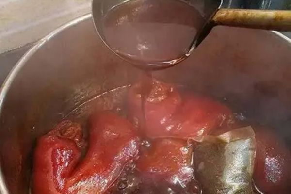 第四步:調色,潮州鹵水一般取原色為主,顏色的產生主要源自糖色,其次來自于老抽,所以產生的顏色是金紅色,而非濃黑的醬色。