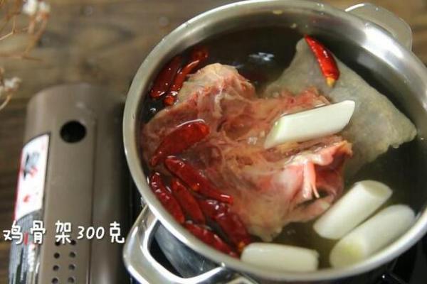 6、放入雞骨架和適量鹽。