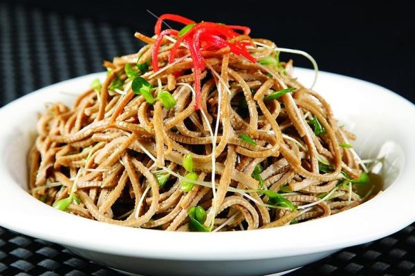 1、豆腐皮開水焯水1分鐘,胡蘿卜去皮切成絲,黃瓜切絲,香菜洗凈切碎