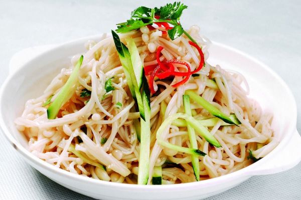 食材:金針菇200g、小米辣三個、干辣椒一小把、小蔥一根、香菜1顆、蒜三瓣、生抽、醋、鹽、糖、花椒油
