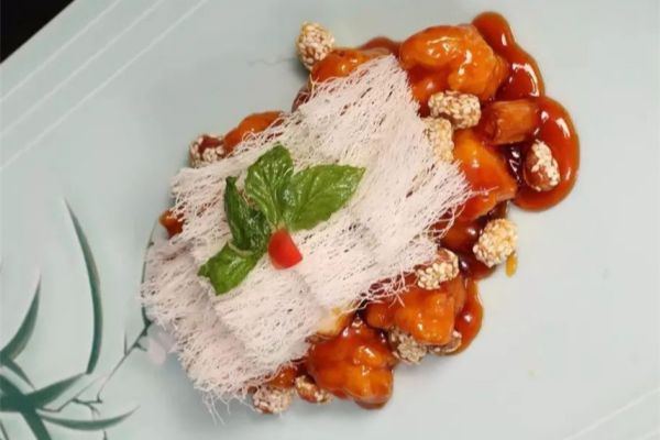 軟熘黃河鯉魚焙面是豫菜的傳統菜肴,李志順大師在此基礎上創新,用蝦仁代替鯉魚,將原來的糖醋口改成荔枝味型,色澤金黃、酸甜微辣,搭配炸香的龍須面,是河南傳統菜與四川宮保味型的完美結合。
