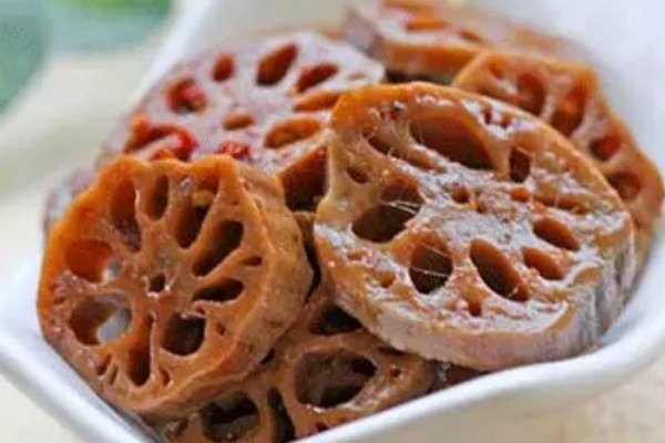 10.一直煮到藕呈平均的紫紅色,關(guān)火;把藕片浸泡在鹵湯里,直到變涼后,即可食用