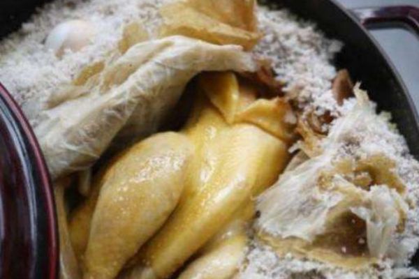 起初,客家人將宰凈后的原只雞先用鹽堆腌制、封存,要食用時,直接蒸熟即可,即“客家咸雞”。據(jù)傳,有一位客家婦女兒女成群,其中一位小孩體弱多病,因當時缺乏各種營養(yǎng)食品,就將用鹽腌制后的雞,用紙包好放入炒熱的鹽中用砂煲煨熟,小孩食用后,身體逐漸恢復,強壯起來,并參加科舉考試,中了狀元。