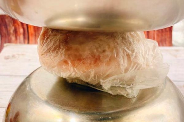 首先我們準備兩個鋁盆,然后將冰凍好的肉放入到保鮮膜中,接著一個鋁盆的盆地朝上放著,再把冰凍肉放在上面,最后把另外一個鋁盆的盆地放在肉的另一面,耐心等待20-30分鐘,肉就會完全解凍,此解凍過程不需要任何的其他輔料,就常溫放著即可。冬天夏天都適用。