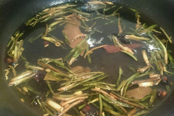 將5斤色拉油放入少許八角20克、山奈5克、桂皮15克、香葉10克香料煉制一下,然后將粗孜然粒2斤放入不銹鋼器皿中,將煉好的熱油徐徐倒入里面,邊倒邊攪拌,自然放涼即可。