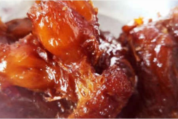 深紅色。一般調制這個顏色,需要鹵水顏色深一點,這個色除開醬油,老抽等,只能用糖色來調制,而要用糖色來調制深紅色,唯一的辦法就是糖色炒老一點,只是糖色炒老了,在鹵水中加入過多,會造成鹵水發苦。這時同樣可以按照上面的辦法炒制糖色,因為加了紅曲粉,顏色比較深,在調制深紅色時,只需要在鹵水中加入少量糖色即可,因此可以避免因糖色炒得老而使鹵水發苦的弊端。