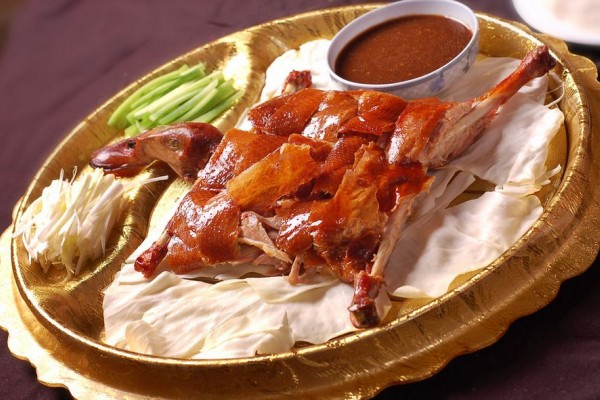 北京烤鴨,烤出來(lái)是沒(méi)有味道的,純白味!吃時(shí)用春卷皮及大蔥絲搭配裹起來(lái),再配上特制蘸醬,沾食!所以這個(gè)蘸醬才是特點(diǎn)!在操作上與粵式烤鴨不同的是從肋下開(kāi)刀取膛。