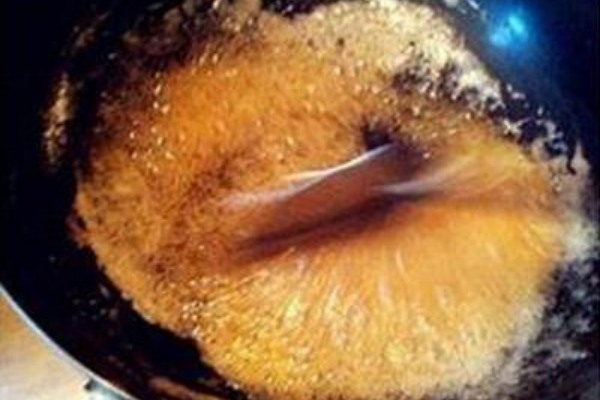 炒糖色的油一定不能太多,如果油太多,會(huì)附著在糖液的表面上,不利于觀察其色澤,影響判斷,增加炒糖色的難度。