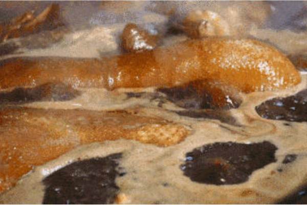 3、豬腳:由于豬腳含膠原蛋白,應小火鹵制火大容易糊鍋、也會導致豬腳開裂,鹵制時間為1.5小時;