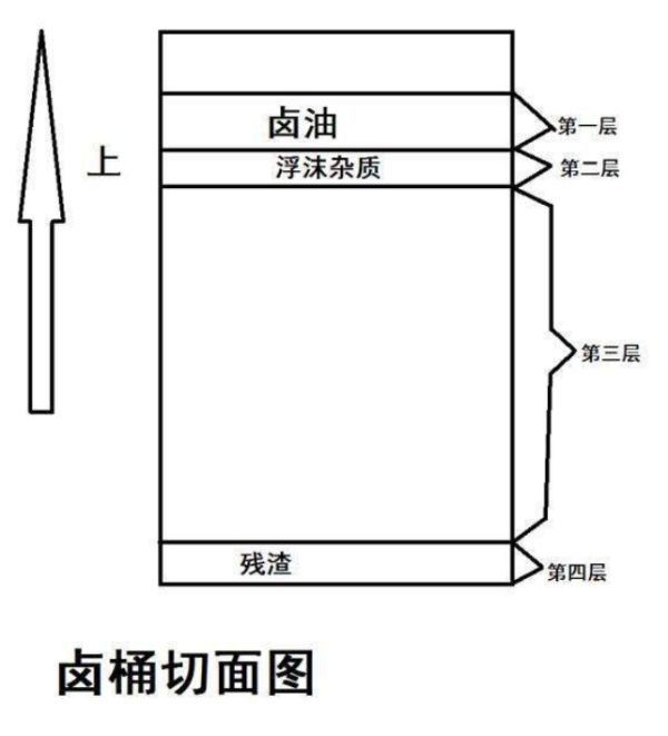 鹵水第四層之所以需要清理,是因?yàn)檫@一層大都是料渣和肉渣,如果不清理時間長了會產(chǎn)生藥罐子的味道和薅味,清理的具體方法是,保持鹵水在靜止?fàn)顟B(tài)下,先撇出鹵油,再打掉浮沫,然后用瓢輕輕的分層舀出鹵水,這個過程用力一定要輕,盡量不要攪動到下面的鹵水,以免料渣和雜質(zhì)浮上來,然后將細(xì)紗布平鋪在漏勺內(nèi),左手拿漏勺,右手拿水瓢,將鹵水通過細(xì)紗布過濾到另一不銹鋼桶內(nèi),當(dāng)桶底剩余三指深的鹵水時,全部倒掉,一般情況下,我們會舀出3/4的鹵水,然后倒掉底層剩余1/4的鹵水。因?yàn)榈讓?/4的鹵水,除了含有料渣,肉渣,同時還含有一些很細(xì)小的懸浮雜質(zhì),經(jīng)過以上清理后,基本鹵水就變得干凈了。