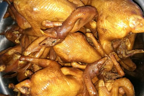 13.鹵汁要專鹵專用,不可混為一鍋。如:鹵雞、鴨、鵝、兔、豬肉、豬心、豬舌、蹄花為一類鹵汁;需辛辣味較重的鴨頸、鴨翅、鴨爪、鴨腸類為一類鹵水;含淀粉較多易變質(zhì)的豆制品和藕類則為一次性鹵水;腥味較重的腸和肚類為一類鹵水;牛、羊肉各為一鍋鹵水。