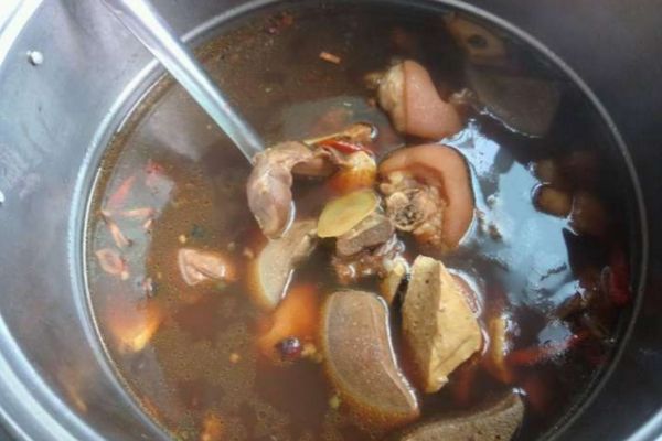 其次,用白酒浸泡與下油鍋炸香是配合使用,具體做法是先將香料噴少許白酒至濕潤(一斤香料噴三兩白酒為宜),裝入塑料袋扎緊,以免香氣揮發,浸潤幾個小時之后一起倒入低溫油鍋中小火浸炸至出香,撈出香料裝入紗布袋,連同炸香料的油一起倒入鹵水桶中。由于大多數香料為酒溶性或脂溶性(即其中所含呈香物質易溶于酒精或油脂),因此白酒浸潤+低溫油炸具有加速香料出味的作用,但需注意的是白酒浸潤時要密封、炸過香料的油要一起倒入鹵水,否則香料的味道會流失。這種方法適用于調初始鹵水,目的是加快香味的揮發,使第一桶鹵水盡可能香濃。