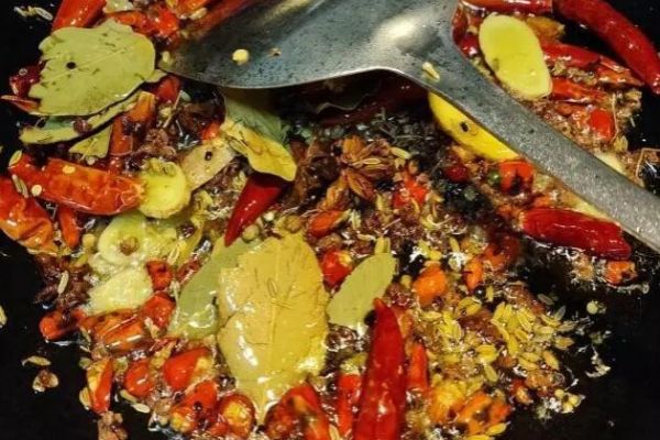 油炒法適用于油溶性高、水溶性低的香料,也適用于揮發性高、個頭小的香料。大多數香料中的有效香味物質都是油溶性的,用油炒能用熱量激發香料中的香氣,也利于香味的溶出。油炒法可以用植物油炒,也可以用雞油炒。雞油可以在市場上買來雞肥油自己在家熬煉。油炒法不光能出香,還能讓各種香味較好的融合。制作鹵水封油,就是香料油炒法的典型應用。