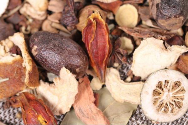 草果1斤、木香0.5斤、香砂1.5斤、砂仁0.8斤、草蔻0.5斤、蓽菝0.5斤、丁香0.5斤、白蔻2斤、白芷0.5斤、山柰0.5斤、香果0.7斤、良姜0.8斤、小茴香1.5斤、肉果1.5斤、甘草1.5斤、煙桂0.9斤(屬于桂皮的一種,香味比普通桂皮更重)、肉桂0.6斤、桂丁0.5斤、干香茅1斤、桃草1斤(形狀類似茅草,味道則接近毛桃,有防腐作用)、梔子1斤(可調和湯汁顏色)、毛桃1斤(有吸附雜質的作用,能使湯汁清靚)、花椒0.5斤、八角2斤、香葉1.5斤、孜然1.5斤、當歸1斤、黨參0.5斤、干辣椒1斤、陳皮0.5斤。