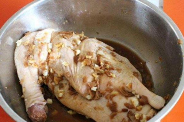 第二步,腌制鴨子:準備一只4斤重的鴨子,取一個盆,下入鹽25-30克,下入姜末15克,下入蔥末10克,下入秘制料酒30克,和勻后里外擦遍鴨子全身,并按摩10分鐘!多余的酒渣和鹽姜渣全部倒入鴨肚子里!還有鴨嘴也別忘了灌點進去!冬天腌制12個小時,夏天腌制6個小時。