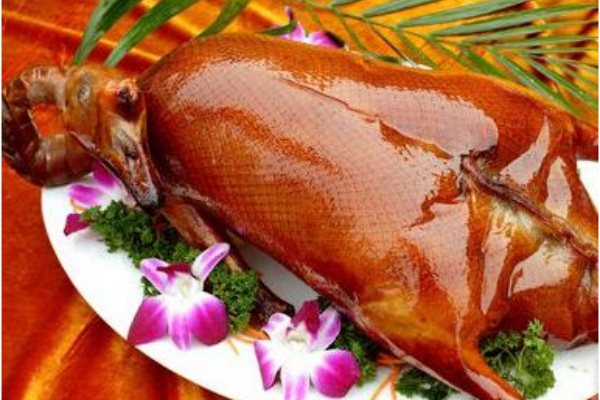 將晾干的鵝掛入烤爐中,用果木木炭燒中火慢烤,烤至鵝肉熟透時,改用大火將鵝的表皮烤至酥脆,取出,先倒出鵝腹內的鹵汁,將鵝斬件裝盤,再淋上鹵汁,隨酸梅醬味碟上桌蘸食即可。