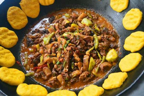 客人直接從鍋里舀出肉塊,放入碗中食用,極具江湖菜的粗獷風情。吃完主料可以添湯涮菜。