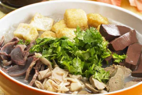 需要準備的食材:鴨血250克、綠豆粉絲90克、油豆泡50克、鹵鴨肝1個、鹵鴨心1個、鹵鴨腸適量、鹵鴨胗1個、濃湯寶1塊、鹽1克、香菜2根、香蔥2根、大蒜2瓣、姜末3克。