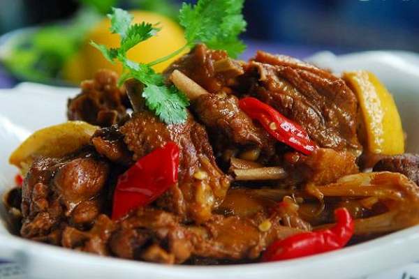 (7)換鍋后再炒3分鐘,需不斷顛鍋,使鴨塊成熟均勻,之后加入酸檸檬200克再炒1分鐘即可。