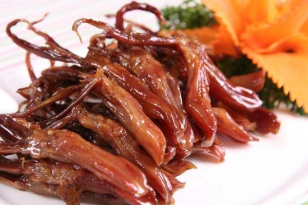 制作:將鴨舌泡入調料腌制2個小時,撈出將鴨舌風干,蒸熟即可。