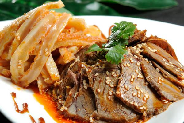 夫妻肺片,屬于川菜中代表性的菜品,通常以牛頭皮、牛心、牛舌、牛肚、牛肉為料,制作精細,調(diào)味考究。夫妻肺片的材料中并沒有“肺”,據(jù)說,夫妻肺片原名“夫妻廢片”,因材料來自于屠宰廢棄的動物內(nèi)臟而得名。這道菜麻辣鮮香,細嫩可口,深受人們的喜愛。