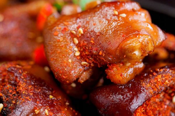 烤豬腳又稱烤蹄,有四種口味:原味、蜜汁味、檸檬味、地獄辣味。原味豬腳即將豬蹄烤后搭配鮮咸辣、開胃的蘸碟食用,而蜜汁味的烤豬蹄吃起來則有一股蜂蜜的味道,咸香回甜;檸檬味豬腳是在豬蹄上刷了檸檬汁后烤制而成的。