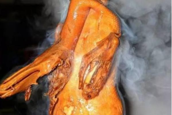 3、鴨子是用鴨油(烤鴨時(shí)滴落的鴨油,當(dāng)然剛開始可用色拉油,在高壓力鍋炸制時(shí),油一般不會變黑,這油可反復(fù)用)炸制的,長時(shí)間放置,色澤會發(fā)生褐變,因此最好是當(dāng)天售完。