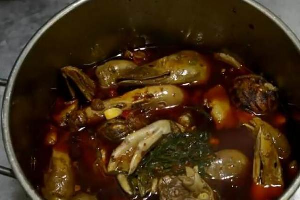 第四步:開始調(diào)整鹵湯,熱鍋燒油,油熱后加入姜,蒜轉(zhuǎn)小火炒出香味,然后放入干辣椒段,炸至最干的時(shí)候,加入適量的料酒,然后加入開水6斤,加入適合自己口味的鹽,適量的生抽,老抽,雞精,白砂糖少許增鮮,攪拌均勻,燒熱后倒入鹵鍋,加入香辣醬100克提升一下口感,鹵水燒開后,蓋一個(gè)盤子,目的是防止鴨頭鴨腳浮上來,這樣熟得快,熟的也快,鹵30分鐘,30分鐘后關(guān)火,不要開蓋,讓鴨頭鴨腳在湯汁中再浸泡一個(gè)小時(shí),它它們充分入味。一個(gè)小時(shí)后,打開鍋蓋,鴨頭鴨腳已經(jīng)鹵好了。挑出里面的小蔥,又香又入味的鹵鴨頭鴨腳鹵好了,好吃又簡(jiǎn)單,一次性鹵一大鍋,吃到爽為止。