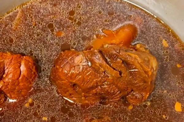 3、如果咱們準備的是純肉的話,只需要放到鹵水里用中火鹵40分鐘就可以了,如果是有骨頭的話,放到鹵水里面一定要鹵70分鐘。