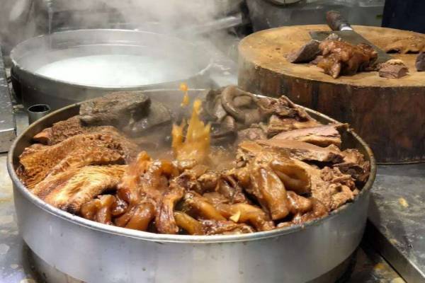 4、用刀將牛雜切成塊,加入鹵汁上碗即成。食時(shí)要足熱,否則失去特色。