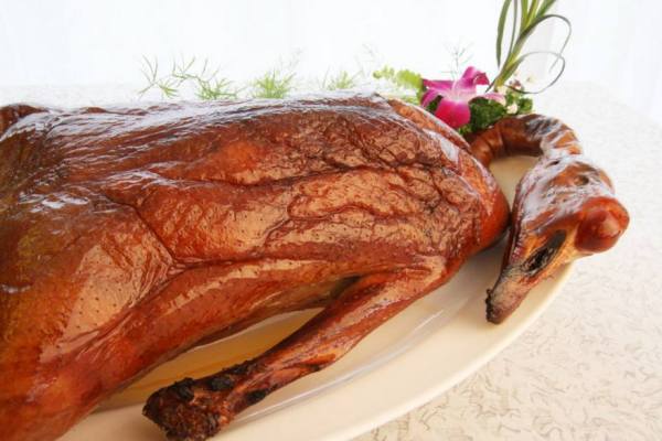 4 、掛入爐中烤時,要掌握好火候,將鵝在爐中轉動幾次,使之受熱均勻。