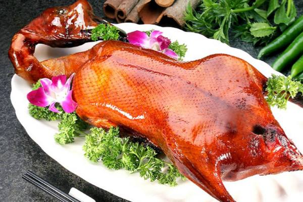 6 、將晾干的鵝掛入烤爐中,用果木木炭燒中火慢烤,烤至鵝肉熟透時(shí),改用大火將鵝的表皮烤至酥脆,取出,先倒出鵝腹內(nèi)的鹵汁,將鵝斬件裝盤,再淋上鹵汁,隨酸梅醬味碟上桌蘸食即可。
