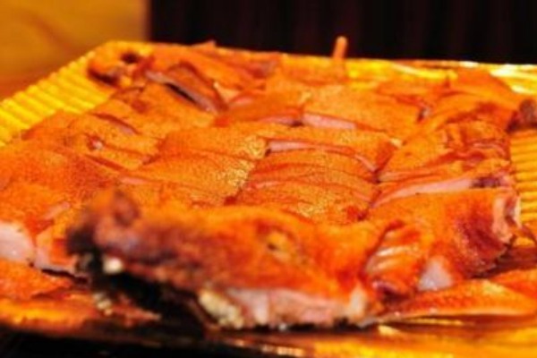 2.用燒臘鉤在豬后腿骨處鉤起,掛入燒爐內(nèi),用中火烘60分鐘至70分鐘,取出掛在風口處,吹涼吹干,待乳豬發(fā)硬后,放入燒豬爐,用文火先燒乳豬內(nèi)腔,后燒豬皮,待豬身爆皮均勻后,再從豬頭開始,將乳豬全身燒至金黃色。