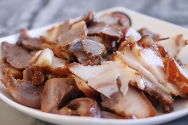 (3)將鹵好的豬頭肉取出,抹上麻油,以保持油潤,食用時切片裝盤,澆上少許鹵汁即成。