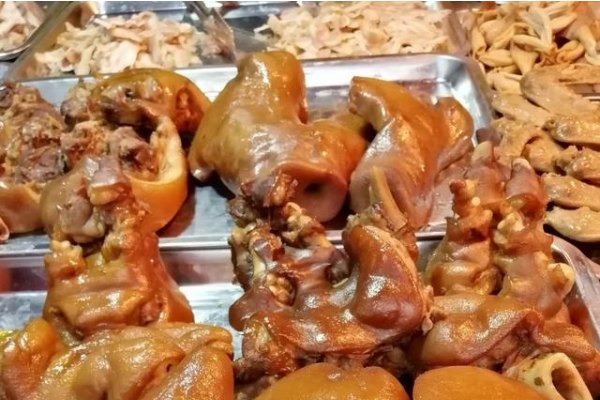 (5)出鍋時要把豬耳朵和拱嘴壓在下邊,使之呈不規則的方塊狀。撈完肉后,湯內加適量味精,并乘熱將豬頭肉刷上一層醬汁即成。