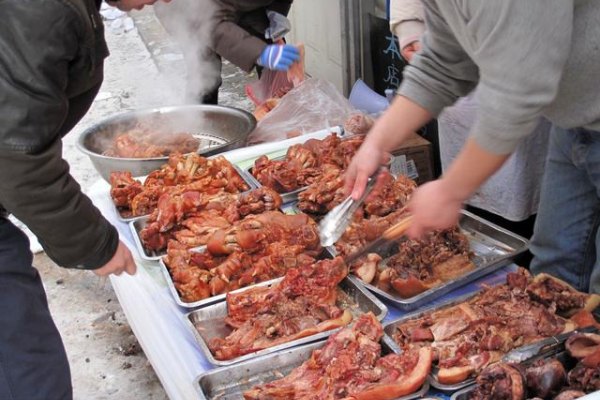 加工白豬頭肉首先是要選好豬頭,然后將松香用火化開,將豬頭刷上松香,待松香冷卻后,即可將松香剝去,放在冷水中浸泡,最后將豬頭各處的細毛用烙鐵燒紅燙掉。洗凈后將豬頭從中一破兩半,并割去耳根洗凈。將放有老湯的鹵鍋上火,放入豬頭,不加任何調料,煮兩小時即可。將浮油撇去,撈出豬頭,放入冷水中浸泡成白色即成。