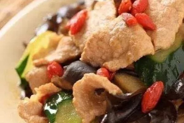 原料:肉片300克,黃瓜1根,冬筍200克,木耳、枸杞、蔥、姜、蛋清、鹽、高湯、糖、料酒、香油、水淀粉、油各適量