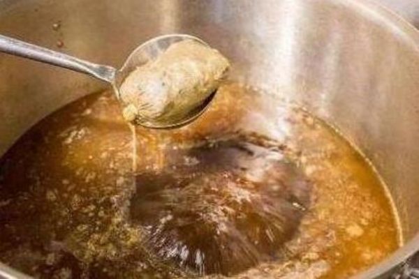 做潮州鹵水配料、調(diào)料準(zhǔn)備好,還需用老母雞、棒子骨、排骨、醬油、桂圓肉 、肥豬肉等先熬煮高湯,再加鹵料包熬制。潮式鹵水講究濃香入味,再加點肥肉來煲湯底,鹵水湯底很有光澤。