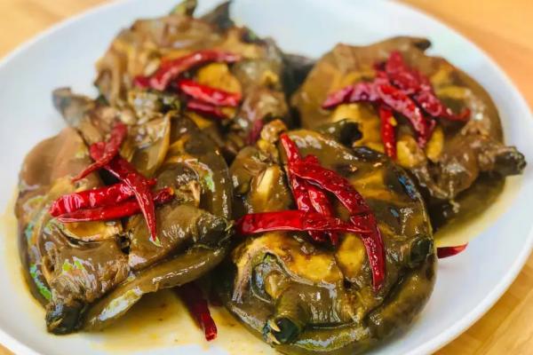2、將小甲魚下入燒沸的油鹵水中,小火煮5分鐘,撈出控干水分。3、鍋入寬油燒至七成熱,下鹵好的甲魚浸炸至表皮收縮、略微發(fā)干時撈出,趁熱放入自制醬料中腌制12小時。