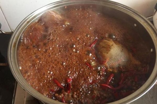 9.取適量鮮湯,放入蔥姜、調入精鹽、少許味精和糖色,放入香料包,加入紹酒,燒沸后轉小火慢慢熬半小時,至香味四溢時,即成新鮮鹵水