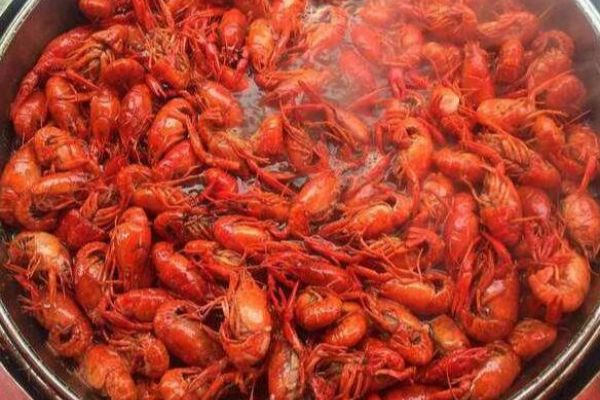 須先將湯汁燒開再添紅油,使二者顏色融合,形成誘人的金紅色,否則油會浮在湯表面,形成斷層,接著再放20kg小龍蝦煮熟。