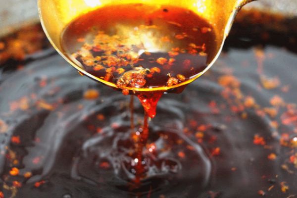 2、鍋入菜油燒至九成熱,陸續(xù)放入大蔥、生姜、洋蔥和芹菜炸至金黃色時(shí),打去料渣不用,等到油溫降至五六成熱時(shí),再把熱油舀入裝有糍粑辣椒的不銹鋼桶里攪勻,入置兩三天后打去桶里的糍粑辣椒,即成鹵油半成品。
