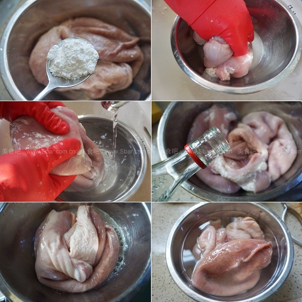 4,豬肚倒入醋、酒、鹽,