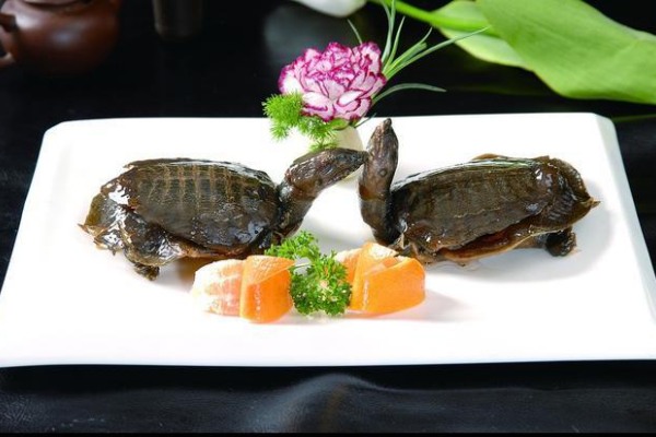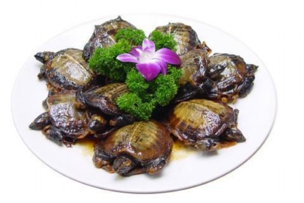 1、小甲魚(每只重約125克)10只宰殺,從龜背下方開一個5厘米左右的小口,除去內臟,沖凈血水,然后放入開水中汆燙一下,撕去表面的粘膜。