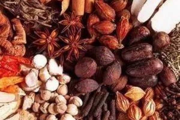 八角1斤、花椒1斤、小茴香1.5斤、草果2兩、畢下2兩、香砂1兩、桂皮2兩、胡椒2兩、丁香1兩、白芷1兩、陳皮1兩半、肉扣2兩。