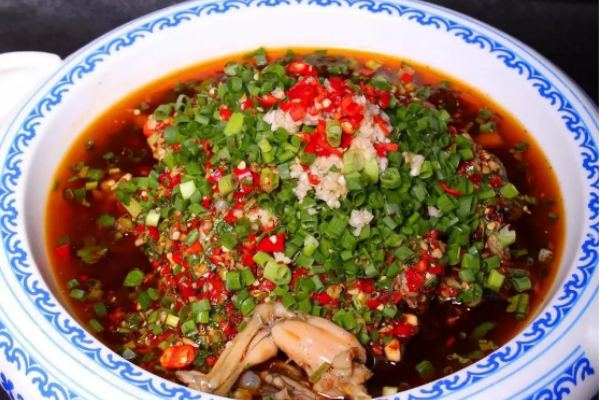 2.取治凈的巖蛙肉400克放入碼斗,加料酒20克、姜末15克、蔥段10克抓勻祛腥,放進漏勺,下入燒至90℃的麻辣油湯中,保持湯面似開非開,微火燜1分鐘至熟,撈出瀝干,盛入墊有蔬菜的盤中,澆入提前拌好的饞嘴汁50克,撒香蔥碎20克,在頂端點綴蒜末、紅椒碎各5克即可上桌。
