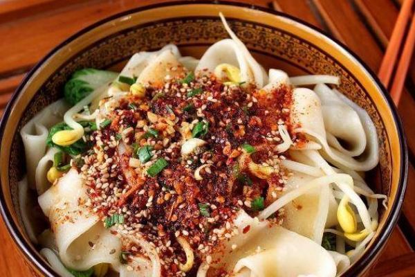 油潑面是陜西傳統(tǒng)的特色面食之一,起源于周代,并以寶雞油潑面最為著名,有鮮香味、酸辣味、香辣味。油潑面是將手工面條煮熟后撈入碗里,撒上蔥花和姜末,調(diào)入鹽、熟芝麻等配料,再加上一層厚厚的辣椒面,然后用滾燙的菜油澆在調(diào)料上,頓時熱油沸騰,滿碗紅光,隨后調(diào)入適量生抽和香醋即可。