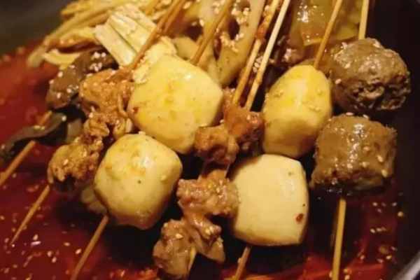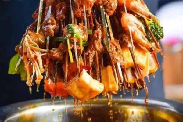 用一大的不銹鋼桶,放入高湯50斤,上面做好的底料8斤,用大火燒沸10分鐘后,調入味精200克,雞精300克,胡椒粉100克,極品籽粉100克,雞肉香精膏50克,火鍋飄香王20克。將湯調至咸鮮味美,就可把客人需要的串串,放入里面燙至菜熟,取出,放入一個調好料的冷鍋里面。
