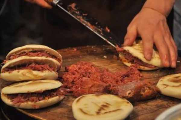 取一塊肉,不用切,用刀一捻,瘦肉就炸開了,肥肉千萬不要碾碎,隨便剁幾下就行,有型才有味。記得舀一小勺肉湯澆在肉上,把冒著熱氣的白吉饃切開,加上汁濃味美的臘汁肉。